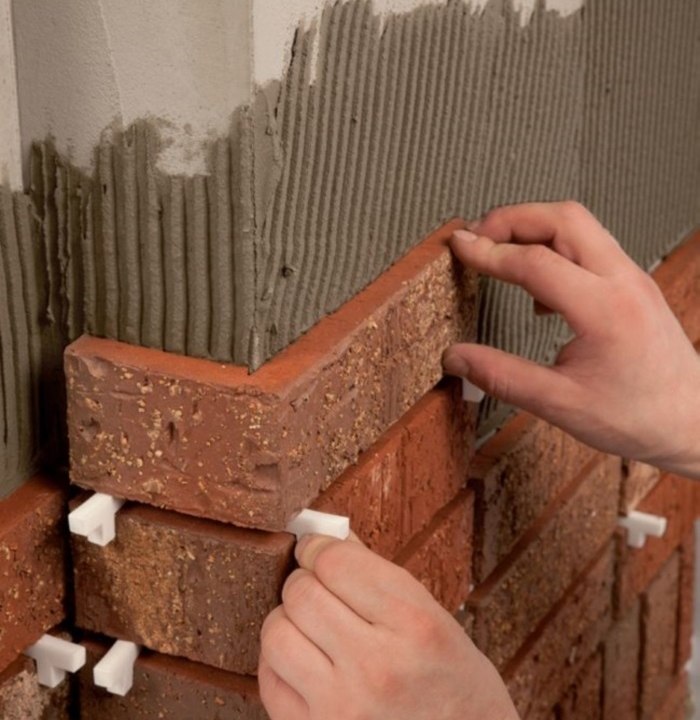 - Si la pierre artificielle a une forme rectangulaire, faites très attention aux coutures verticalement, en contrôlant l'intersection de leurs lignes avec l'horizontale. L'intersection des lignes doit être à angle droit. Cela peut être contrôlé à l'aide du modèle.