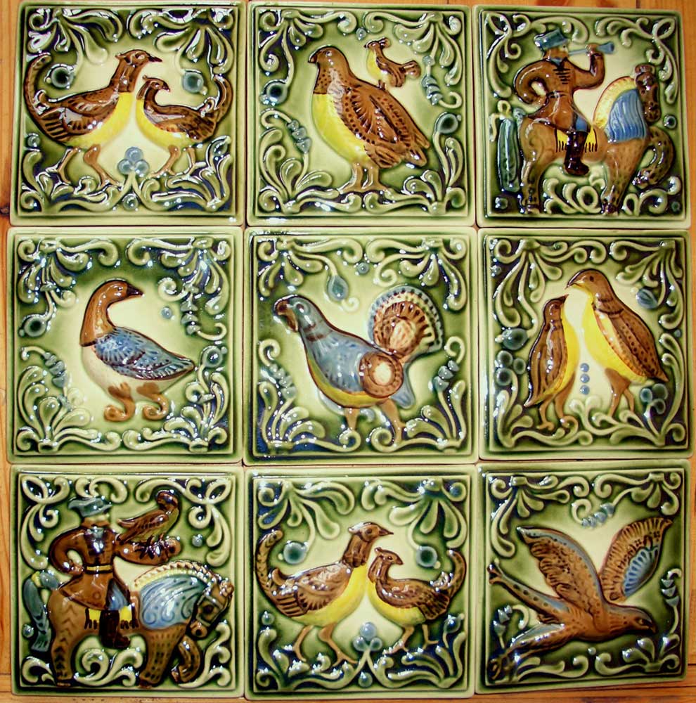 | Le type de tuile le plus ancien. Les carreaux ont une configuration spéciale et sont spécialement conçus pour revêtement de cheminées et poêles. Au dos il y a une croupe (voir photo) avec des trous pour les attaches. En tant que matière première, une barbotine (argile Westerwal) est utilisée. Après application de glaçure et cuisson, il est peint manuellement. | Dimensions 220 * 220 mm et 220 * 250 mm. Le kit comprend les moitiés, les coins, les bordures, les étagères, les corniches, les inserts en relief, les grilles et l'encadrement du four.