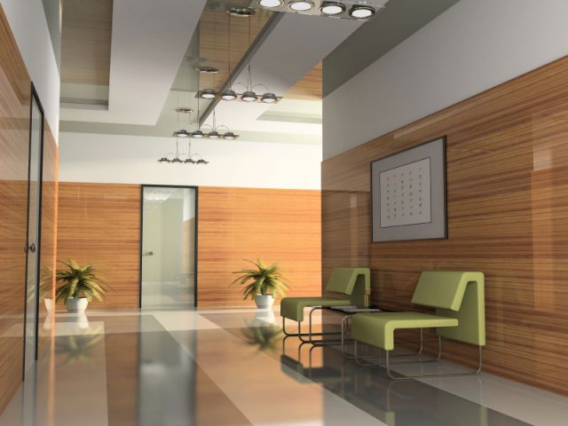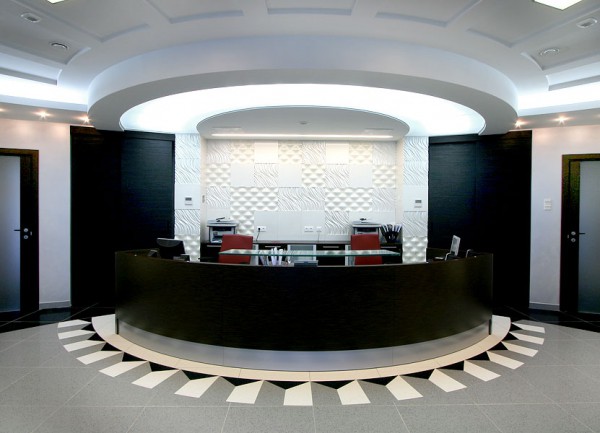 - La décoration de la salle de réception ne doit pas être aussi pompeuse que celle du bureau du directeur et avoir l'air moderne et professionnelle, comme dans notre exemple. Ici, et une structure de plafond chic faite de cloisons sèches et de verre, et de volumineux panneaux 3D sur le mur, et des sols carrelés avec un motif original - simple, de bon goût et rien de plus.