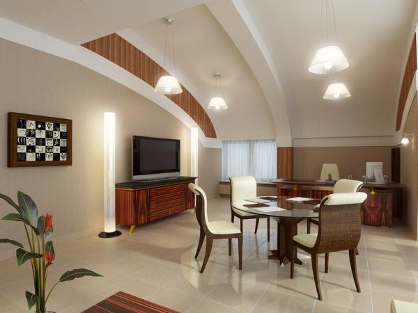 À l'intérieur de la structure du plafond se trouve une bande extensible brillante. Avec le même succès, au lieu d'un film PVC extensible, il serait possible de réaliser un insert en verre. - Soit dit en passant, l'utilisation de cloisons sèches dans la création d'intérieurs administratifs n'est pas rare. Après tout, avant de terminer les murs du bureau, avec son aide, vous pouvez planifier l'espace, faire des cloisons avec des niches de travail qui remplacent les étagères suspendues et les armoires pour ranger les dossiers.