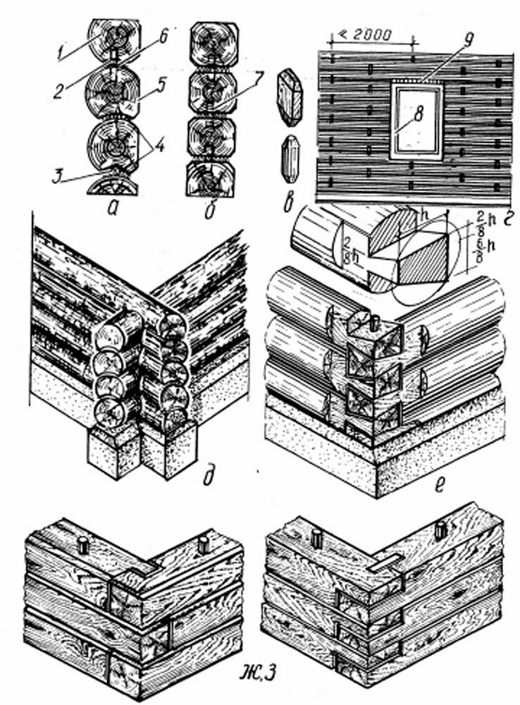 Pour augmenter la résistance de la maison en rondins, les couronnes sont reliées à des pointes en bois par incréments d'environ 1,5 mètre. Après l'érection, les murs rétréciront jusqu'à 6% de la hauteur initiale, ce qui est pris en compte lors de la fabrication de la profondeur du nid pour les pointes - il est plus long que la longueur de la pointe de 2 centimètres.