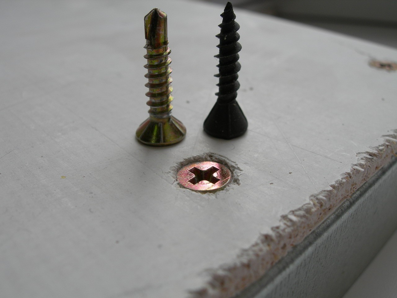 La tête autotaraudeuse doit être en retrait d'environ un millimètre par rapport à la surface de la feuille. Une spatule étroite suffit pour le sceller. Le trou est encastré dans deux mouvements: le premier (coulissant) vous remplissez le trou; deuxième (déchirure), le couteau à mastic élimine l'excès de mastic.