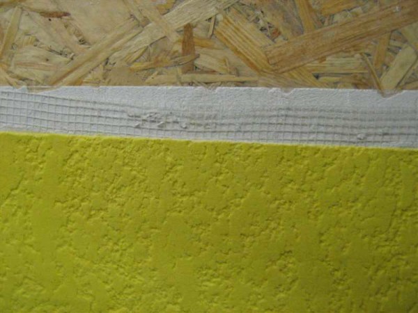 Le treillis en fibre de verre est collé à la mousse à l'aide d'adhésifs cimentaires conventionnels. Après séchage, la surface est meulée et nivelée. mastic de finition.