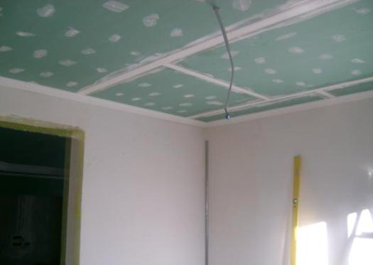 Plus loin. Avant de coller le plafond à partir de cloisons sèches, vous devez vous assurer que les vis ne dépassent pas du plan des feuilles et que toutes les coutures sont brodées.