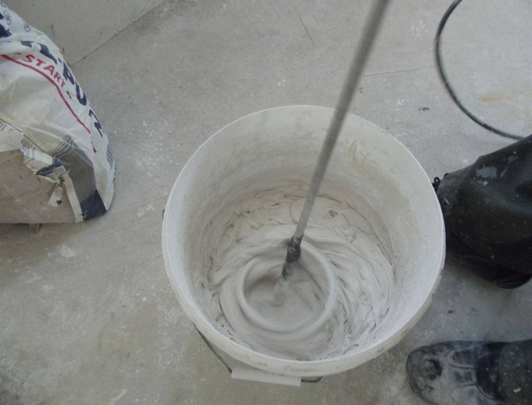 - Lors de la préparation du volume pour le travail, nous prenons un mélangeur, l'abaissons dans un récipient et battons le contenu à un état d'huile ramollie. Dès que la composition est préparée, prenez une spatule de 100 mm. Nous ne travaillons que jusqu'à présent, en l'appliquant. Ensuite, nous prenons une spatule de 450 mm, mettons un mastic dessus avec une fine couche. Nous traitons en surface une bande de largeur égale à la grille.
