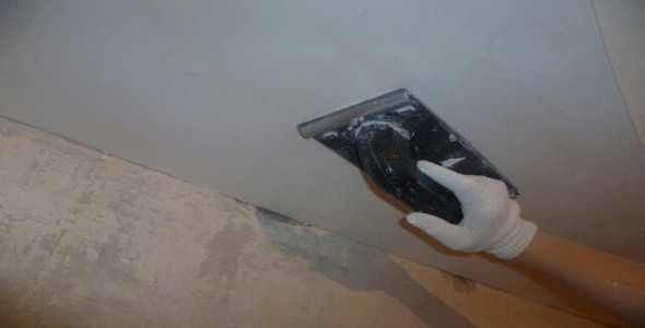 Attention: La principale caractéristique de ce travail est que vous n'avez pas besoin de niveler la surface du plafond, ce qui ne vous fait pas perdre beaucoup de temps. Le mastic doit être appliqué dans un seul but, afin que vous puissiez donner au plafond une douceur uniforme.