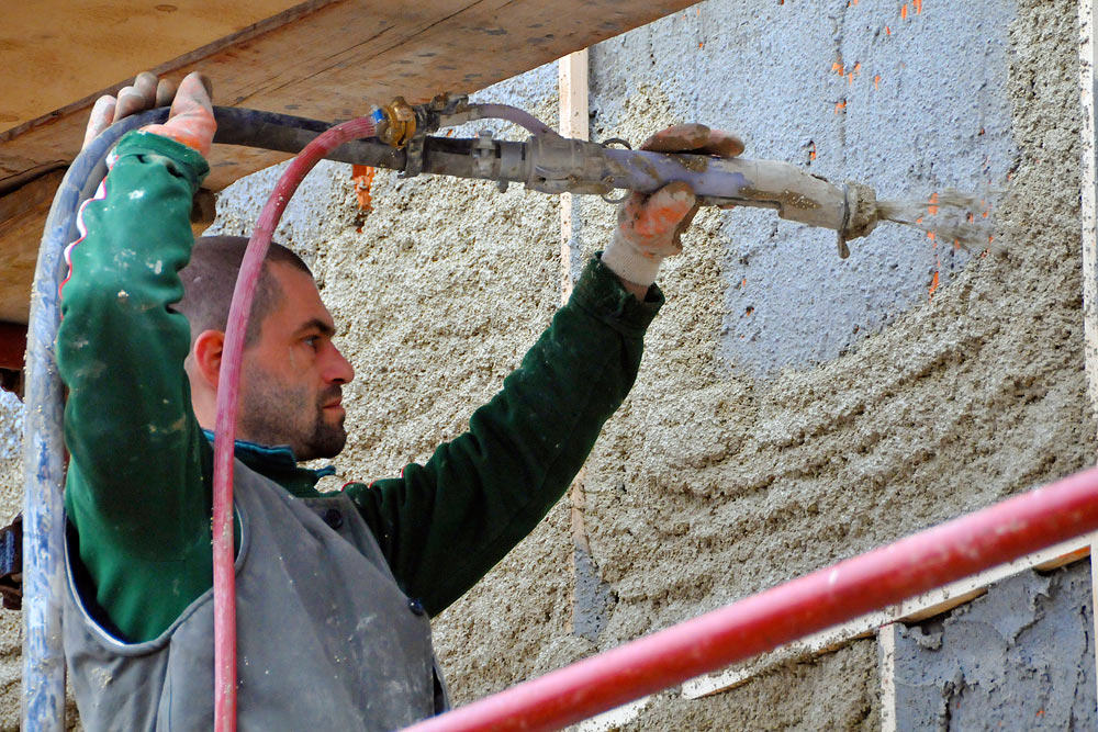 Quant aux mélanges structurels destinés à l'application en machine, ils doivent avoir une consistance légèrement plus liquide, et ils sont légèrement dilués avec de l'eau. Il n'est pas ajouté plus de 300 ml par 30 kg de plâtre. La solution est appliquée en une ou deux couches, à l'aide d'une buse en fonction de la taille de la charge.