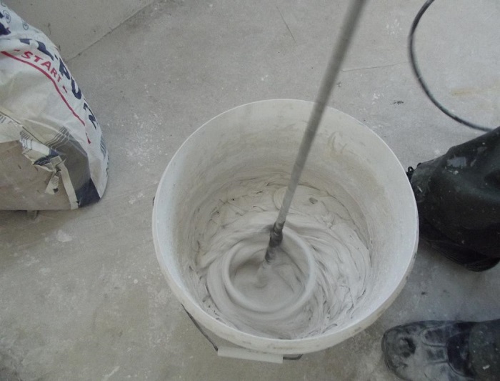 Placer la composition dans un seau propre et diluer avec de l'eau, température 200 C, dans les proportions que les fabricants indiquent sur l'emballage. Ensuite, à l'aide d'une perceuse avec une buse mélangeuse ou un mélangeur industriel, pétrir le produit pour que la densité de la solution atteigne la consistance d'une crème sure épaisse. Laisser infuser 5 minutes.