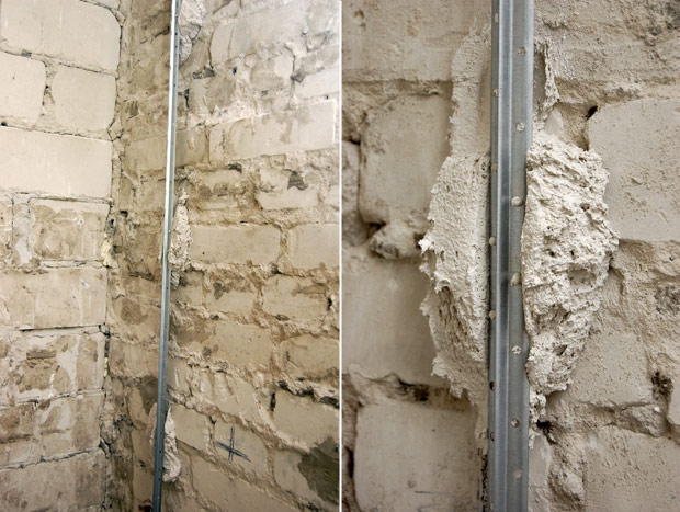 La photo montre la méthode de montage des balises en plâtre constituées d'un profilé métallique.