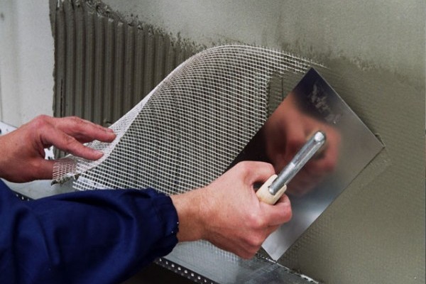• Fixez la maille de fibre de verre aux murs. La technologie est la même que le renforcement des coins.