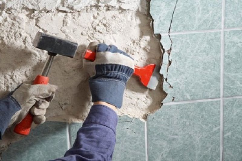 La première étape des travaux est la préparation des fondations du bâtiment. Retirez l'ancien revêtement (comme sur la photo ci-dessous). Après cela, tapez sur la surface avec un marteau pour identifier les défauts. Si des fissures sont trouvées, augmentez leur taille. Amorcez ensuite le défaut et remplissez-le de mortier de réparation.