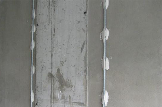 Le plâtrage des murs sur les balises est complété par le meulage de la surface:
