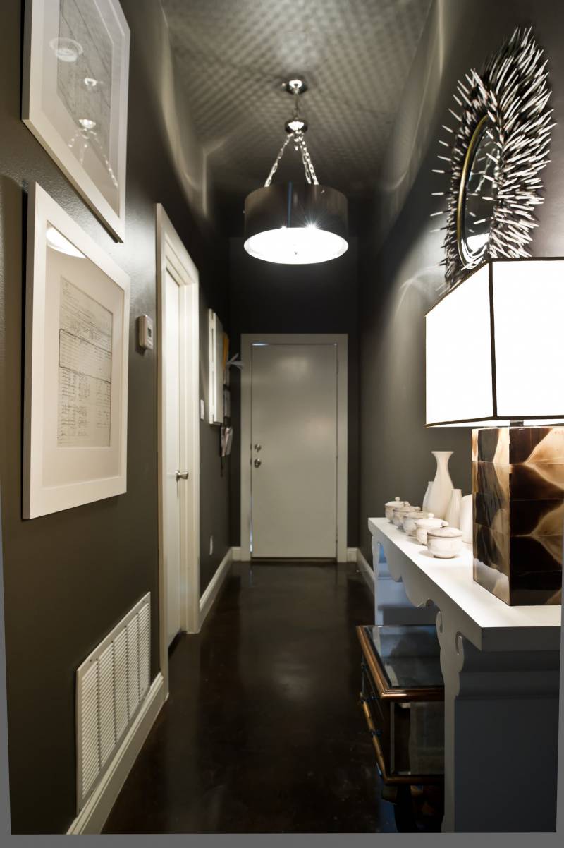 En utilisant la technique de division de la surface du mur en une couleur sombre par le bas et une lumière par le haut, vous pouvez ajuster visuellement la hauteur de la pièce. Important sur la perception de la zone du couloir, a le placement compétent des appareils d'éclairage.