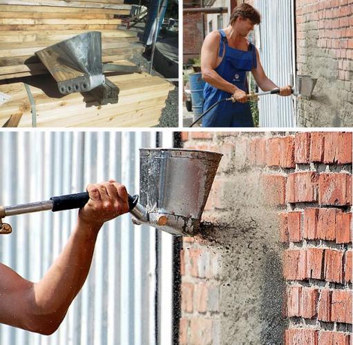 Un dispositif de plâtrage fait maison, comme une unité industrielle, vous permet d'appliquer la solution plus rapidement et mieux que manuellement. L'un d'eux peut être un seau pneumatique fait maison ou une petite trémie.