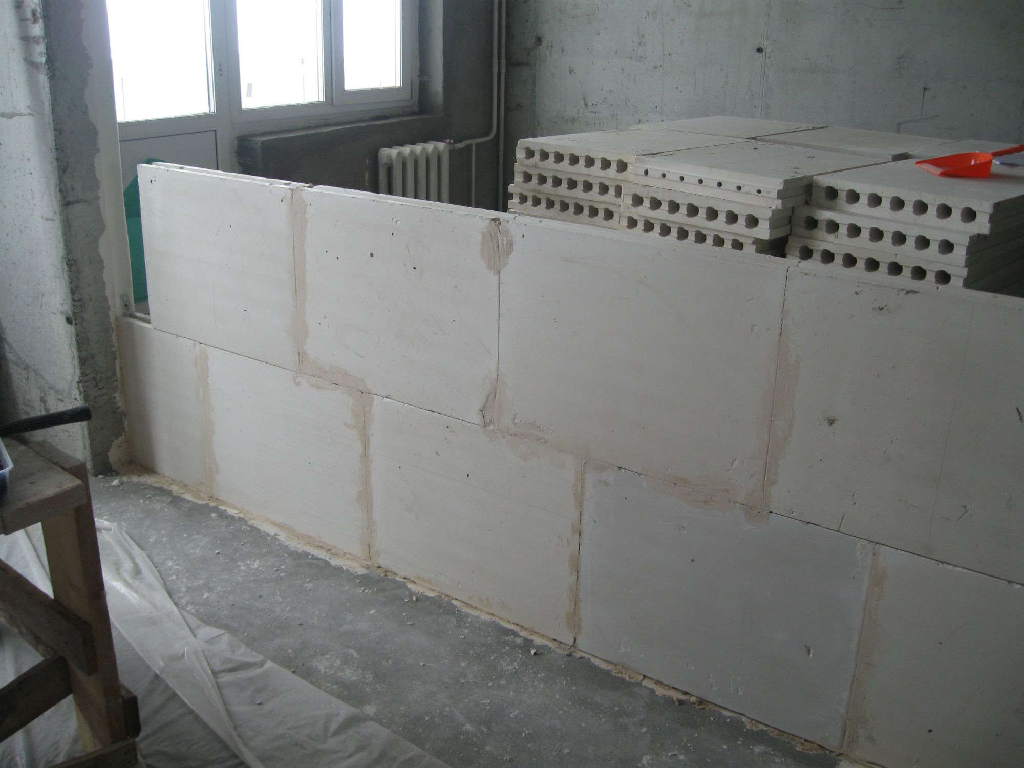 - Montez les plaques de plâtre et les blocs avec une rainure vers le haut - respectivement, le peigne est inséré dans la rainure du bloc sous-jacent. S'il s'agit de la première rangée, la saillie est coupée et nettoyée avec un plan d'épluchage. La base en dessous est toujours lisse, en béton. La position de chaque plaque est vérifiée en fonction du niveau, de sorte qu'un tel mur ne peut pas être inégal en principe.