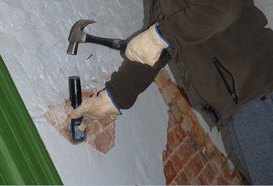 - Vous devez prendre une hache inutile ou un ciseau avec un marteau, puis procéder au tapotement du plâtre. Commencez par le haut.