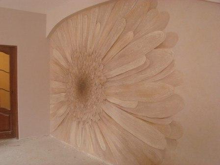 - Sur un support en plâtre fraîchement appliqué avec des bâtons en bois, le motif sélectionné est dessiné. Cela se fait arbitrairement ou à l'aide d'un pochoir. Lorsque vous utilisez la technique du stuc, les éléments d'image convexes sont appliqués avec une spatule ou une truelle. La plasticité du matériau vous permet de simuler les moindres détails de la composition avec une spatule et même avec vos mains.