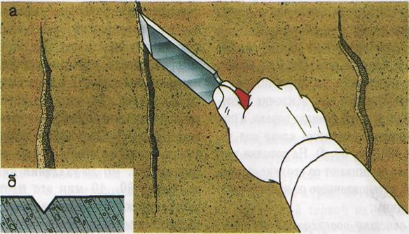 Le travail est effectué par n'importe quel outil pratique: une spatule rigide, un ciseau, etc. Ensuite, à partir des évidements obtenus et de toute la surface avec une brosse dure, les petites particules de poussière et de sable restantes, des fragments de plâtre sont balayés.