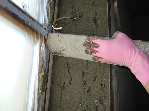 - Le mélange de mortier est appliqué de la même manière, avec une marge, et l'excédent est éliminé à l'aide d'un gabarit, n'atteignant pas 10 cm aux coins de l'ouverture;