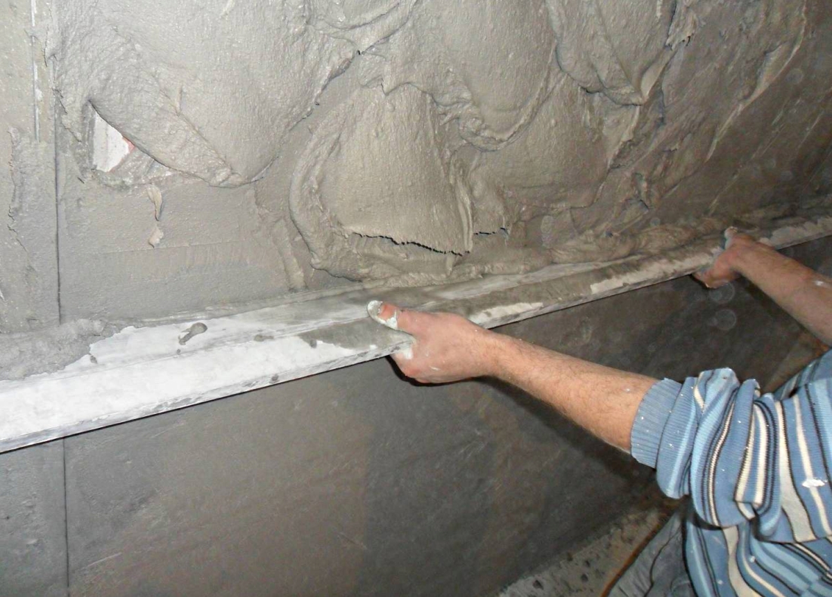 - Pour ce faire, utilisez une agrafe et une solution épaisse. Après l'achèvement, vous devez suivre la règle pour que le plâtre en béton repose en douceur.