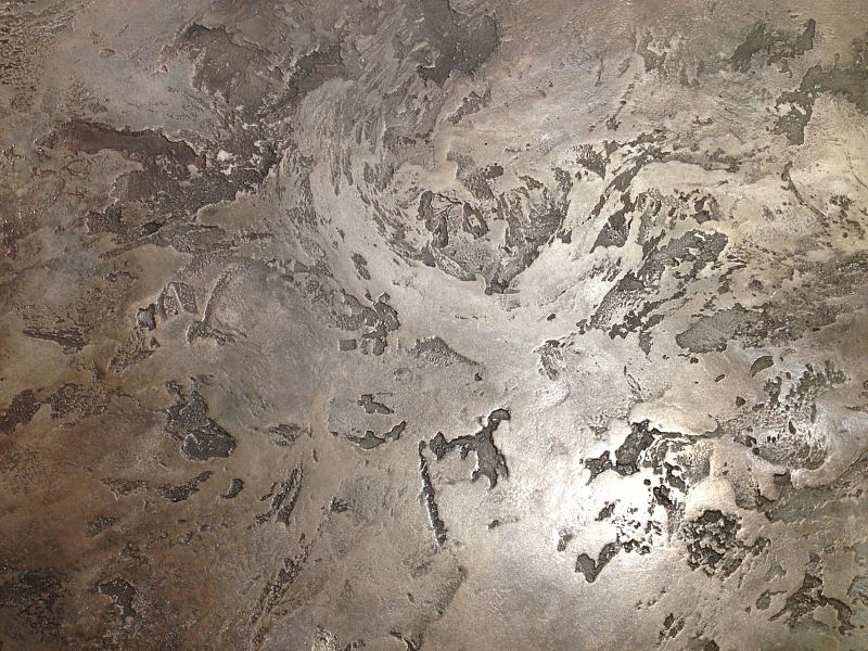 Lors de l'imitation du béton, une teinte de contraste est effectuée sur la surface de la cire. C'est-à-dire qu'avec une peinture d'une couleur plus saturée, une éponge, un pinceau ou un tampon sont appliqués sur les éclaboussures, les taches et les stries.Tout cela est ombré, créant ainsi un effet usé, et après séchage, un revêtement protecteur est appliqué.