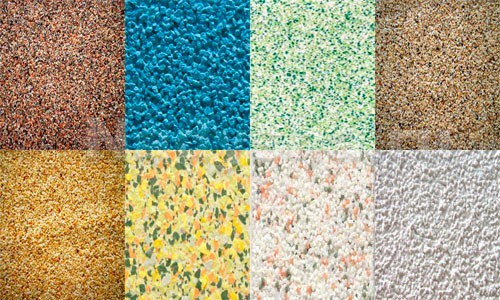 - Texture «Manteau de fourrure» et «Mosaïque» Il est créé à l'aide de compositions à haute teneur en charge, dont les grains ont une fraction inégale. Il est plus uniforme, car les pierres sont empilées les unes à côté des autres. L'apparence de la surface finie dépendra de la taille des grains, de leur forme et de leur couleur. Par exemple, le plâtre de mosaïque se compose de marbre, de quartz, de granit et d'autres minéraux non ferreux broyés dans un liant polymère.