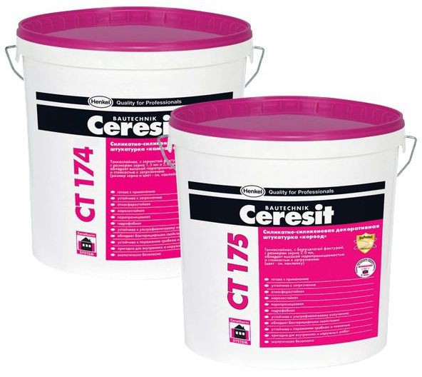 Le plâtre de façade Ceresit est disponible sous forme d'un mélange de construction sec, qui est fermé avec de l'eau avant l'application, et sous forme finie. Le premier comprend principalement des enduits minéraux à base de ciment, le second - silicate, acrylique, silicone (voir Enduit silicone: caractéristiques matérielles), ainsi que leurs mélanges: silicate-silicone, polymère-ciment, etc.