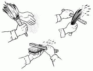- Cela ressemblera à ceci - ils prennent un balai dans une main, un bâton dans l'autre, un balai est plongé dans la solution et a frappé le bâton de sorte que le jet de solution a volé sur le mur. Sur la surface seront des flocons, des pulvérisations, dont la taille dépend du balai et de la densité de la solution. La surface sur laquelle le plâtre est projeté peut être pré-peinte, par exemple, en bleu, et les taches appliquées peuvent être blanches.