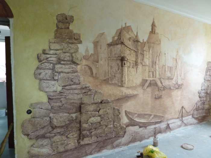 Du plâtre texturé est appliqué sur le plan préparé. Il existe plusieurs options pour ajouter de la texture. Parfois, un calque est simplement appliqué, puis la texture souhaitée est appliquée.