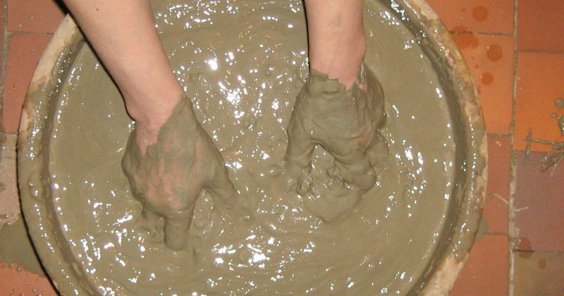 - L'argile est placée dans des conteneurs, de l'eau est ajoutée, puis l'argile est pétrie, mise de côté pendant 24 heures. Ensuite, ils pétrissent soigneusement, puis mélangent à nouveau et ainsi de suite jusqu'à ce qu'ils soient uniformes, si nécessaire, ajoutez de l'eau. Après une agitation répétée, cela devrait être comme de la crème sure.
