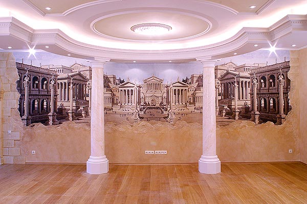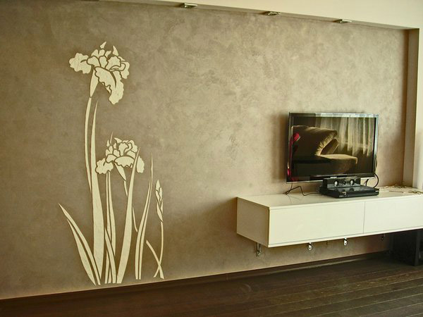Remarque. Le motif, qui est recréé par le maître, est unique et particulier. En raison de la grande variété de textures et de palettes de couleurs, vous pouvez créer des peintures entières sur les murs (voirPeintures en plâtre: faites-le vous-même).