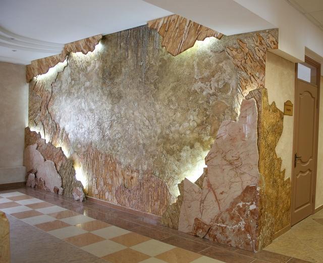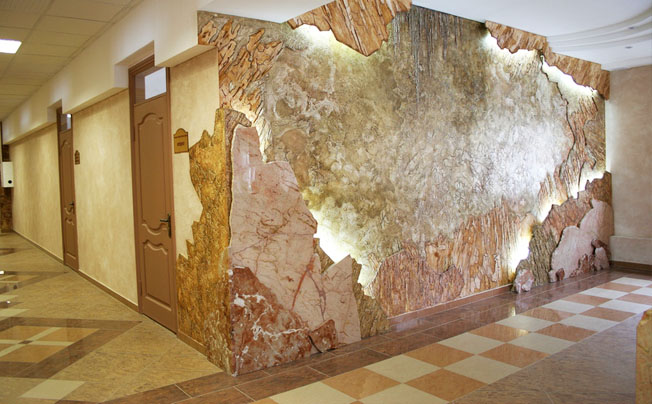 De plus, le plâtre décoratif à grains fins a une texture unique, à l'aide de laquelle d'autres matériaux naturels sont recréés:
