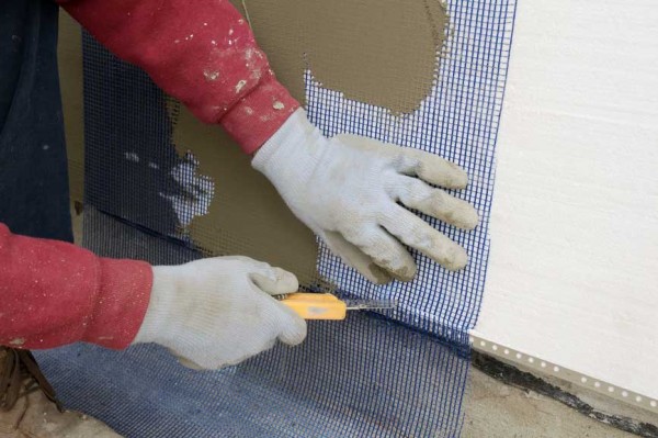 Nous procédons directement à la façon de plâtrer le polystyrène. Tout d'abord, un treillis de renforcement est attaché à sa surface, qui est collé à la composition adhésive ou universelle dans l'ordre suivant: