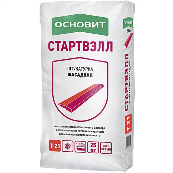 - Founces Startwell T-21. Mélange ciment-chaux, adapté à une utilisation en extérieur comme en intérieur. Il est appliqué manuellement ou mécaniquement (voir Plâtre machine: comment le faire correctement).