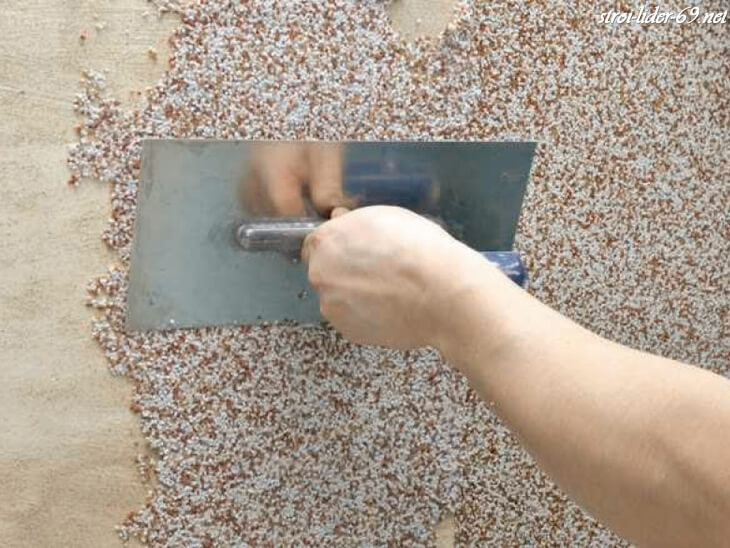 - Une surface qui a déjà été répétée auparavant doit sécher, puis commence directement l'application de copeaux de marbre sur la façade.