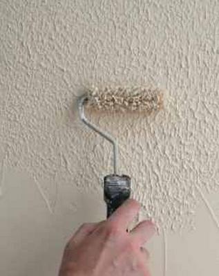 - Un manteau de fourrure peut également être réalisé à l'aide d'un rouleau. Tout d'abord, nous versons la solution sur le mur et ensuite la texture se fait à l'aide d'un rouleau. Ceci est visible sur la photo.