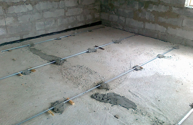 La première étape de l'aménagement du sol brut - coulée de chape de mortier de béton. La qualité de l'installation du revêtement décoratif de finition et de l'équipement de plancher chauffant dépend de la douceur de la surface. Pour obtenir un plan parfaitement plat dans la construction installation de balises pour chape. Ce sont de longues planches de métal, des blocs de bois, des profilés en plaques de plâtre ou d'autres produits. Posés sur la base, ces éléments servent de guide pour la répartition de la masse de coulée sur toute la surface et indiquent également le niveau de la hauteur du sol. Parfois des balises pour chapes fait simplement à partir d'une solution. Le mélange de béton est coulé en parallèle sur la base sous la forme de bandes de la hauteur souhaitée. Après solidification selon ces directives, aligner le mélange versé sur le sol.