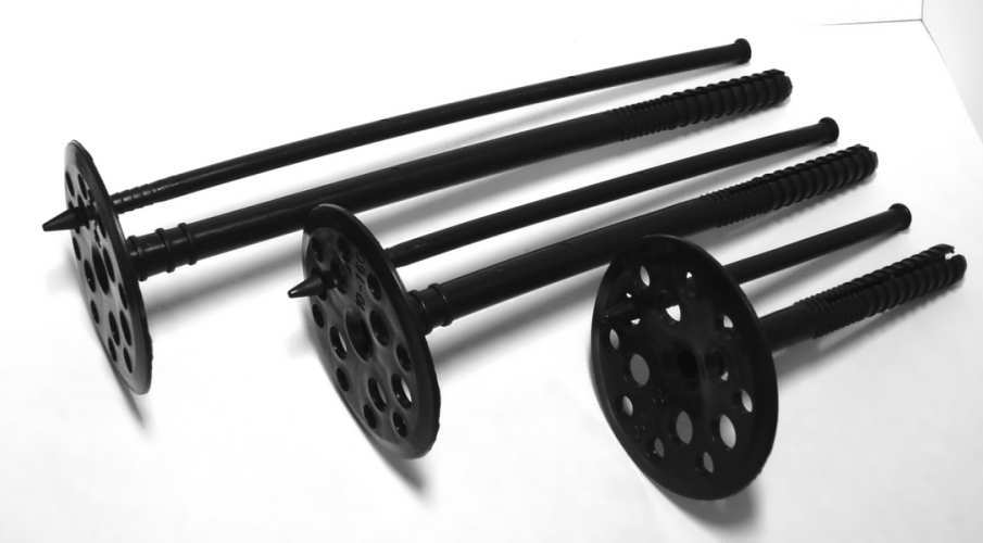 - L'isolation est fixée avec des champignons, des capuchons en plastique spéciaux avec un manchon dans lequel un clou en plastique ou en métal est enfoncé. La meilleure option peut être un clou en plastique, car un clou en métal est plus cher et deviendra un conducteur de froid supplémentaire dans la conception de la façade. Vous devez également éviter les économies et prendre des attaches en plastique plus chères. Contrairement aux analogues bon marché, ils s'enfoncent bien dans le mur et ne se déforment pas.