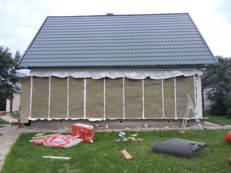 - Une couche de membrane perméable à la vapeur est déposée sous l'isolant. Dans ce cas, le film est perméable à la vapeur sur le mur de la maison et lisse - sur l'isolation. Le rôle de la membrane est d'assurer l'élimination de la vapeur d'eau des surfaces des murs du bâtiment à travers l'isolation.