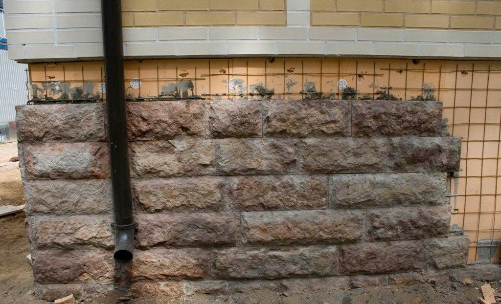 La doublure de la base en moellons convient à toute décoration des façades. Si la décoration des murs extérieurs est faite de briques de parement, la base est également préférable d'être confrontée à des briques de parement, avec une surface sous une pierre déchirée.