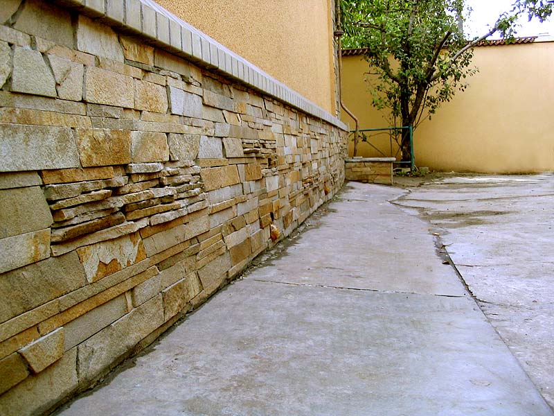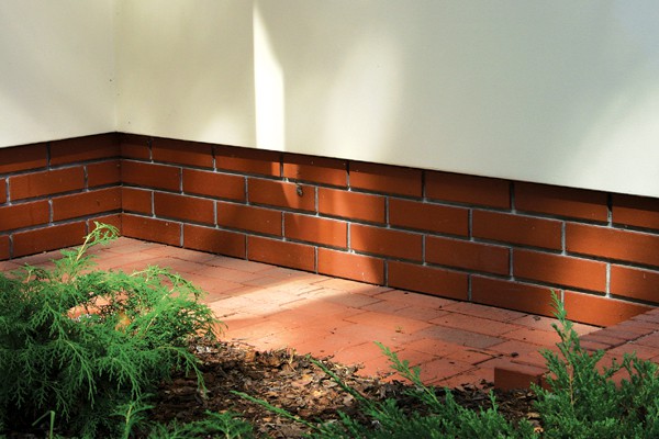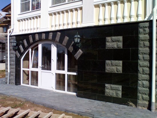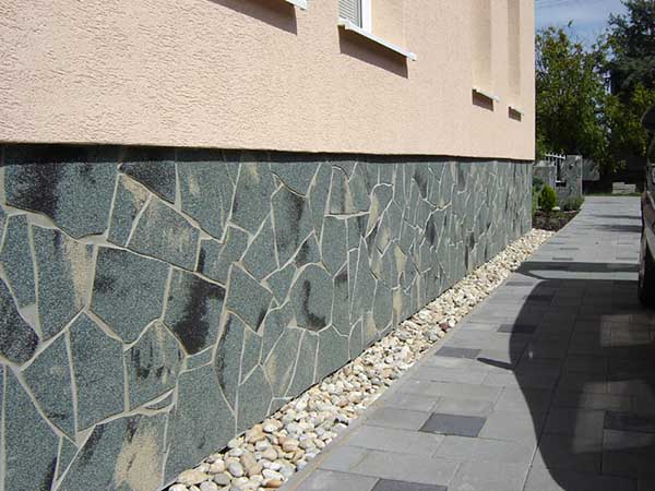 Naturellement, une approche légèrement différente est nécessaire pour sa conception. - Le parement de la fondation en bande, dans ce cas, est souvent réalisé à l'aide de dalles de grand format en pierre naturelle ou en grès cérame, en parement de briques. Ces matériaux lourds doivent nécessairement être basés sur la fondation et leur application est généralement prévue dans le projet.