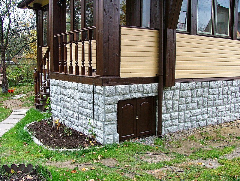 - La deuxième façon de décorer l'espace sous le grillage est la plus simple, et le prix final, au final, est plus bas. Pour la conception de la fondation, le revêtement de sous-sol est utilisé avec toutes sortes d'imitations de maçonnerie et de maçonnerie, de tuiles, de tuiles de clinker.