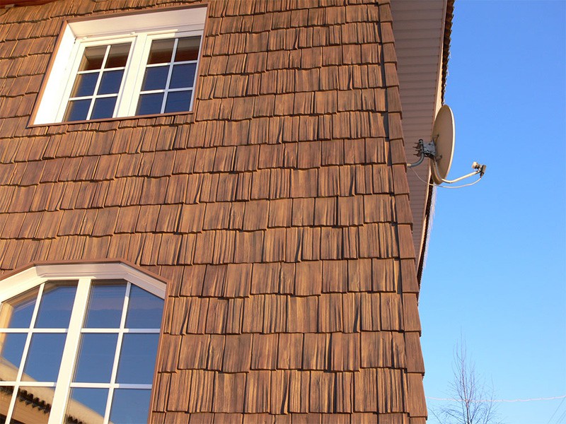 Pour les murs semi-circulaires, ce n'est généralement pas l'option la plus idéale. - En coupant le chanfrein sur la plaque à un certain angle, le maître peut créer une surface volumineuse lors du montage des bardeaux. Et diversifier la surface permet une combinaison d'éléments de différentes essences de bois.