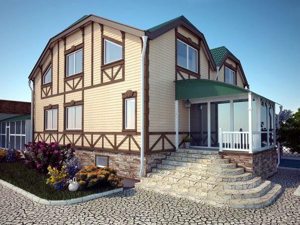 - Quant à la conception de la façade, elle peut être réalisée, par exemple, dans le style du fachwerk (voirFinition de la façade de la maison dans le style fachwerk ou classique du genre), comme sur la photo ci-dessus. Dans le même temps, vous pouvez utiliser soit une planche de revêtement classique imitant une poutre, soit du bois thermique à section rectangulaire.