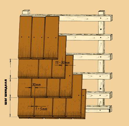 - Bardeaux montés sur une caisse en bois, comme indiqué sur le schéma. Le motif le plus simple est une série de tuiles qui se chevauchent.