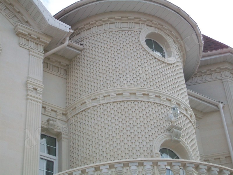 - Par conséquent, la matrice est souvent utilisée pour décorer des fragments de la façade: des fenêtres ou des zones d'angle, un panneau sur le fronton, qui peut ressembler à l'exemple ci-dessus. La paille de pierre la plus populaire dans la conception des locaux.