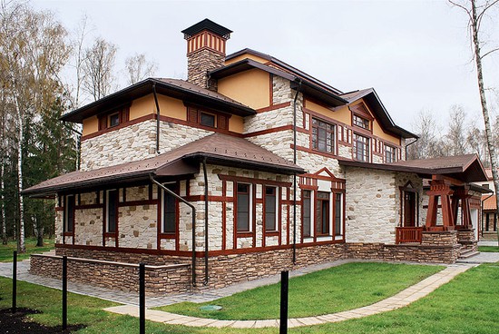 Les maisons les plus belles et de haute qualité sont probablement obtenues finies en combinaison, en utilisant différents matériaux. Ensuite, vous pouvez résister à de bons paramètres et en termes de transfert de chaleur et de conception, vous obtenez un design plutôt original.