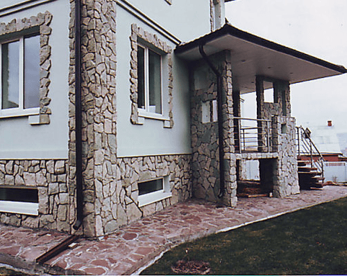 Très souvent, ce matériau est utilisé dans la décoration en combinaison avec la brique. Différentes parties de la façade sont terminées.