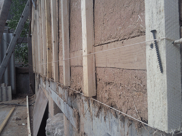 Ne montez pas l'arbre au coin. Il faut reculer d'un couple voir. Cet endroit sera nécessaire pour effectuer le parement; - Maintenant, nous clouons les bandes perpendiculairement au sol à une distance d'environ un mètre les unes des autres. Il n'est pas nécessaire de maintenir la taille jusqu'à cm.
