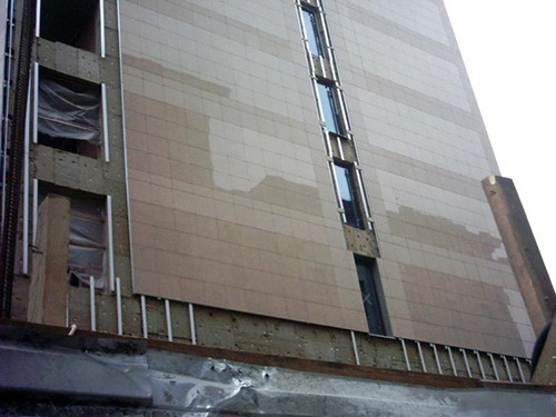 - Façade ventilée en granit est une structure adjacente au mur extérieur du bâtiment. En fait, il s'agit d'un solide bouclier de tuiles installé à une certaine distance du mur, couvrant le matériau isolant.